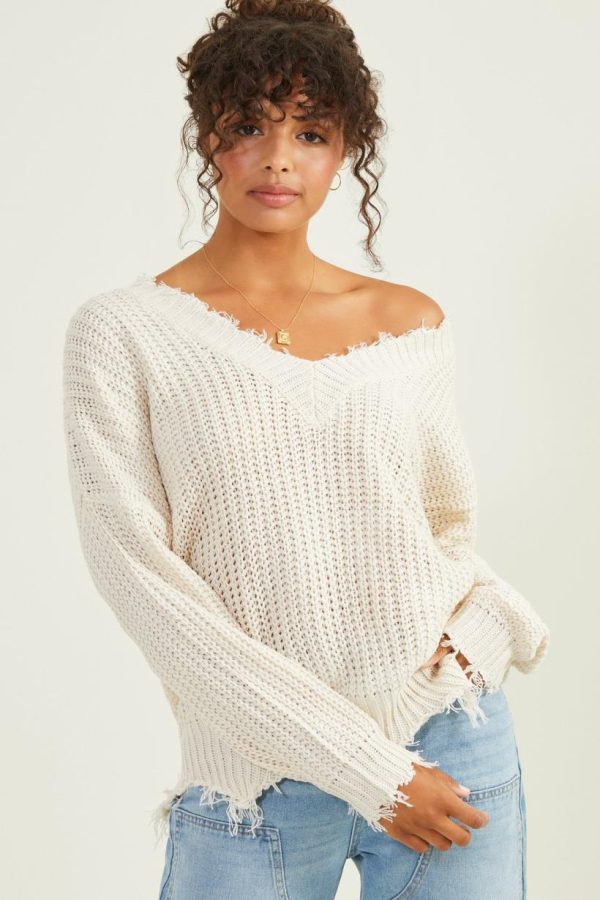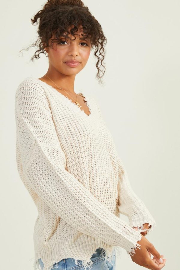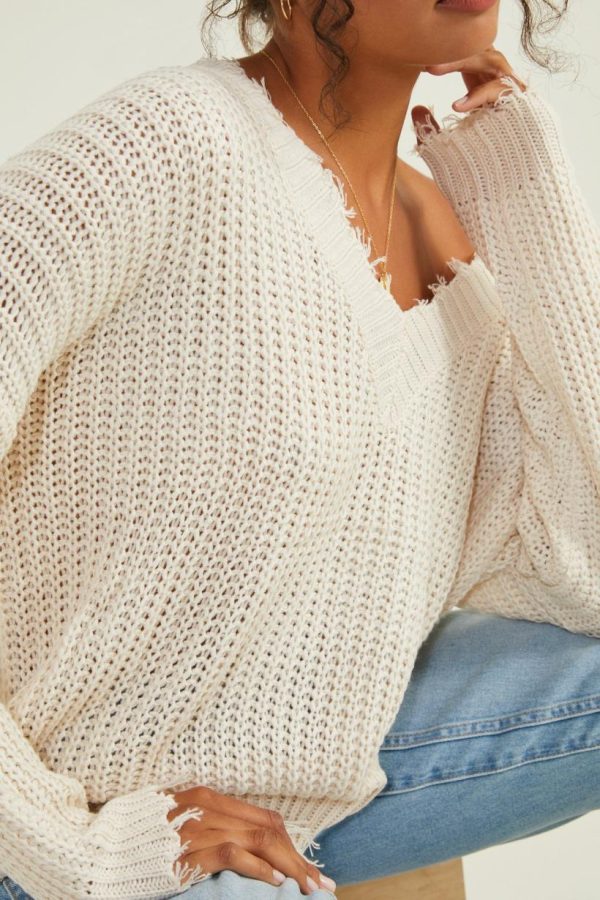 A versatile addition to your cold-weather transitional wardrobe. This sweater’s elegant cut beautifully frames the neckline, creating a flattering silhouette that is effortlessly relaxed. The standout feature is its distressed hemlines, which add a vintage vibe to its classic design.