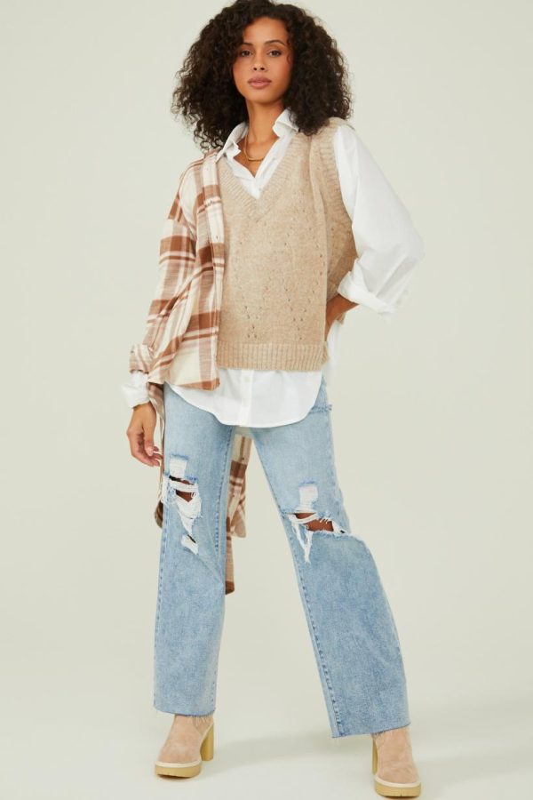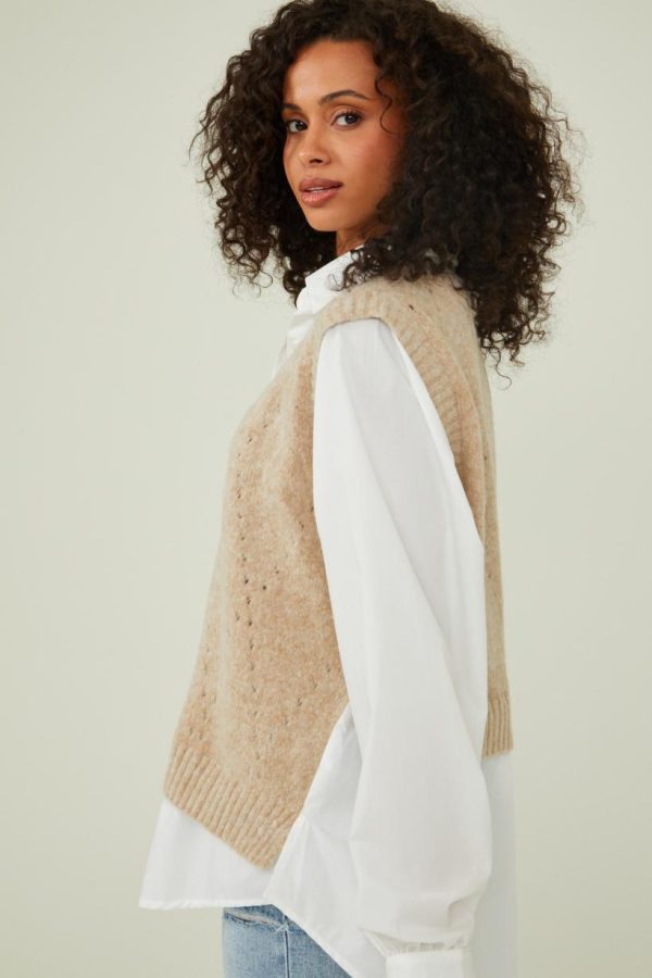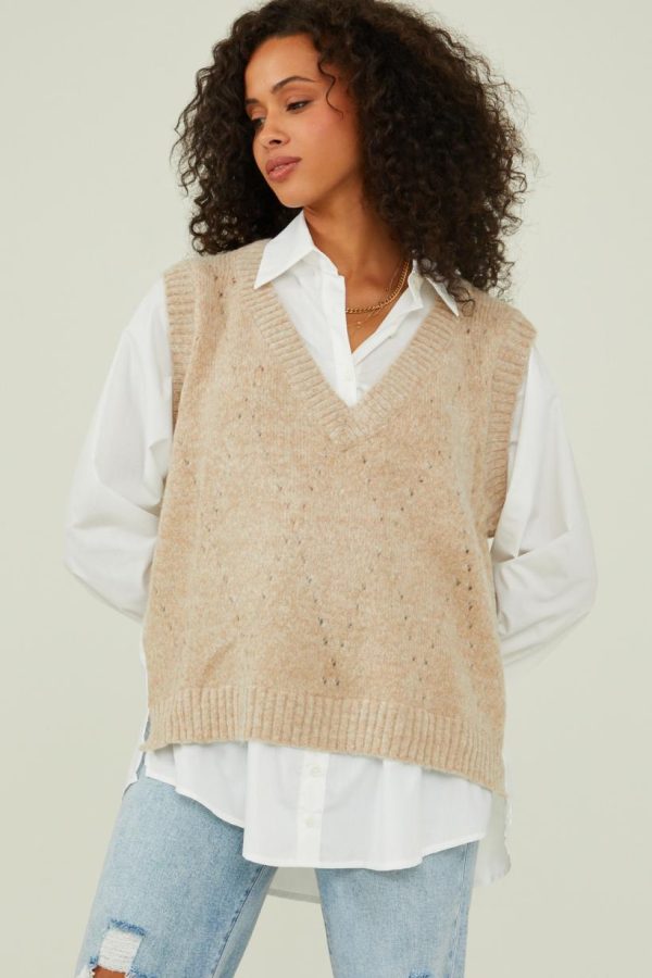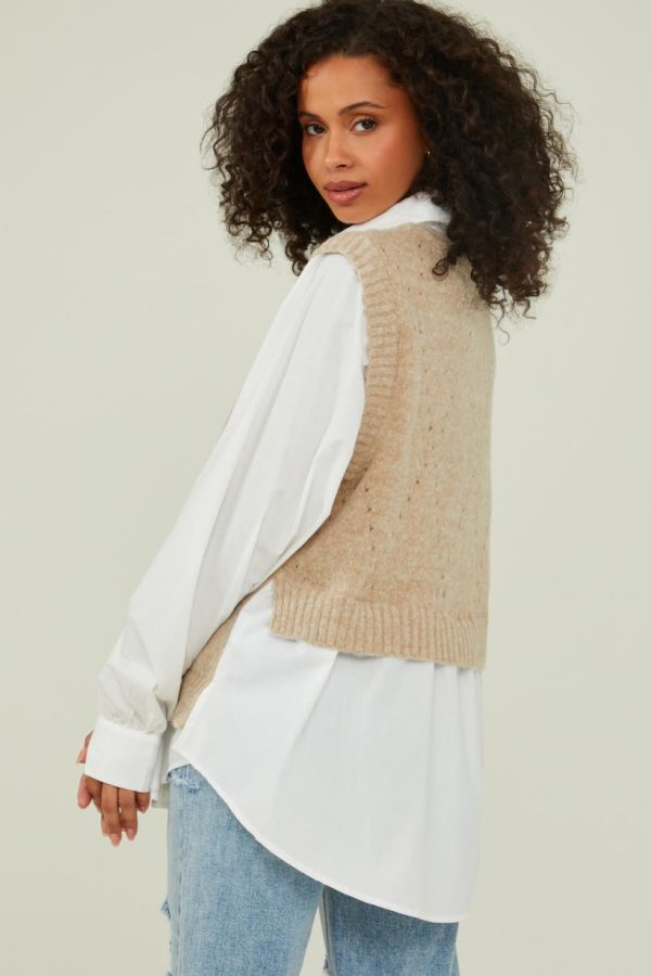 This unique and innovative design brings together the timeless style of a classic button-down shirt with the warmth and coziness of a soft sweater vest. The combination of the button-down shirt and the sweater vest creates a stunning layered effect, offering a trendy statement that’s hard to miss. Completed with an oversized fit, you’ll be staying oh-so comfy and cute.