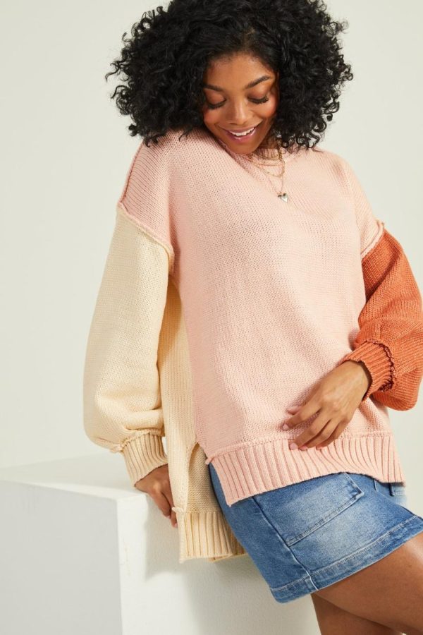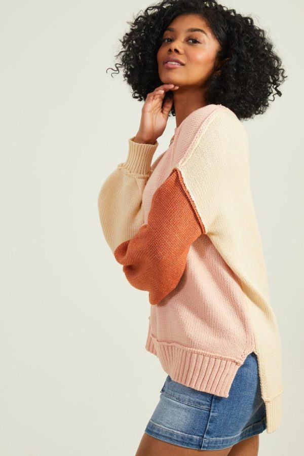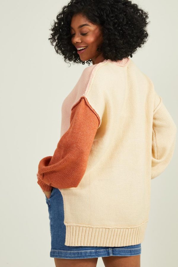 A modern take on the classic cozy essential. This sweater features a contemporary colorblock pattern that adds a pop of vibrancy to your outfit. The oversized fit exudes a relaxed and laid-back vibe, ensuring both comfort and confidence throughout the day.