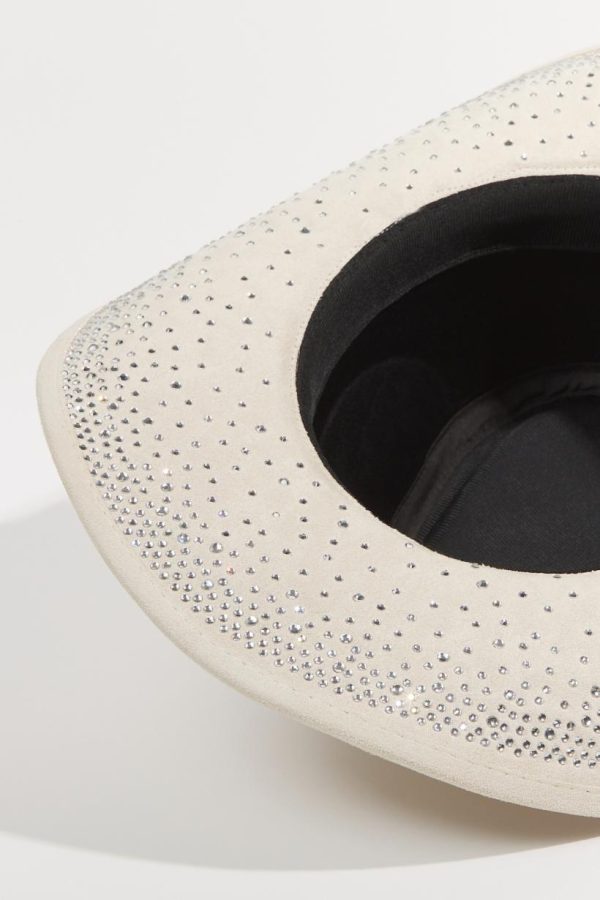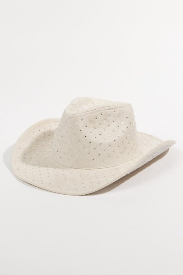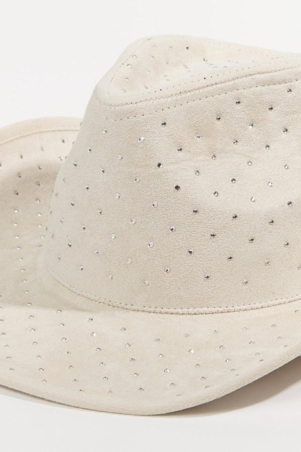 This cowboy hat is adorned with rhinestones, offering a glamorous twist on a classic Western style. This hat adds a touch of sparkle to your outfit, making it perfect for special occasions or a night out on the town.