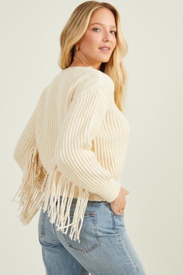 This sweater is all about texture and movement. The ribbed knit adds a touch of classic style, while the fringe detailed sleeves bring an on-trend and western-inspired element to your outfit. The fringe creates a sense of dynamic flair with every gesture, making this sweater an instant conversation starter.